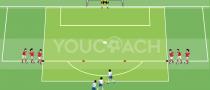 - Ο παίκτης της λευκής ομάδας μετακινείται αμέσως στο κέντρο της επισημασμένης περιοχής και η άσκηση αρχίζει ξανά με την κόκκινη ομάδα στην επίθεση.