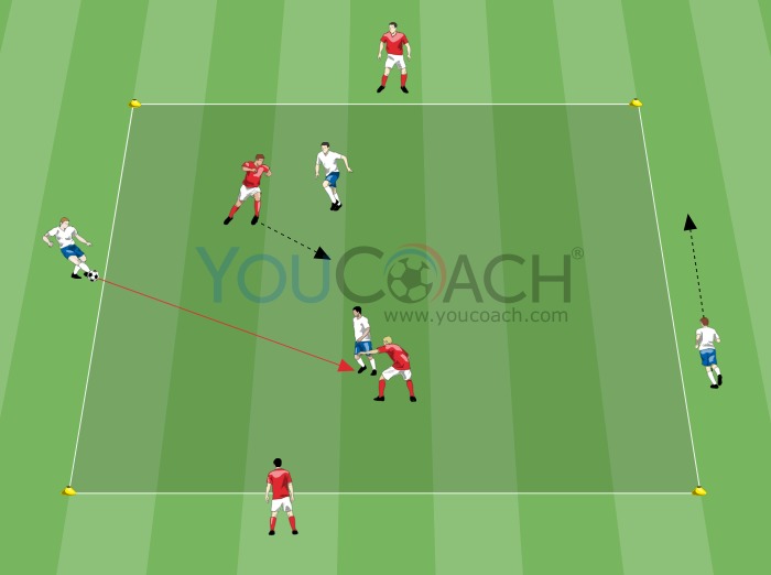 • Με αυτού του είδους τις ασκήσεις μπορούμε να εμφυσήσουμε βασικές έννοιες για την κατοχή. Έχοντας ως σημείο αναφοράς τις δύο πλευρές της ομάδας, μπορούμε να δώσουμε μια κατεύθυνση στο παιχνίδι εμφυσώντας έννοιες όπως το συνδυαστικό παιχνίδι, η υποστήριξη, το παιχνίδι με πλάτος και βάθος.