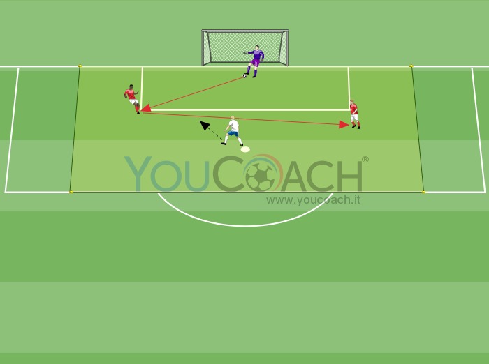 Απλοποιημένη κατάσταση: δύο αμυντικοί και ένας τερματοφύλακας εναντίον ενός επιτιθέμενου για την εξάσκηση της κατασκευής και της άμεσης ολοκλήρωσης. |