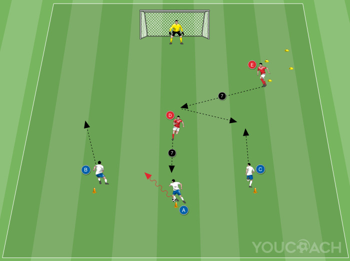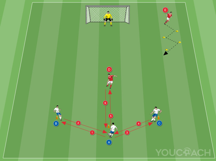 Τοποθετήστε ένα τέρμα μέσα στον αγωνιστικό χώρο. Περίπου 25 μέτρα μακριά από το τέρμα μια γραμμή από 3 κώνους που απέχουν μεταξύ τους 10 μέτρα με τον κεντρικό κώνο ένα μέτρο πίσω. Τοποθετήστε έναν παίκτη (Α, Β και C) κοντά σε κάθε κώνο. Ο παίκτης Α ξεκινά με την μπάλα. Περίπου 7 μέτρα μπροστά από τον παίκτη Α, τοποθετήστε τον αμυντικό Δ. Δημιουργήστε μια διαδρομή πλέξης από την πλευρά προς την πλευρά κοντά στο τέρμα χρησιμοποιώντας τους 4 δείκτες. Ο αμυντικός Ε παραμένει στην αρχή της διαδρομής. Ο τερματοφύλακας υπερασπίζεται το τέρμα.