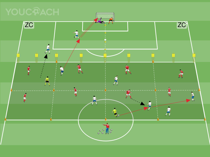 Ο αγωνιστικός χώρος χωρίζεται σε δύο οριζόντιες ζώνες, η πρώτη από τη γραμμή των 20-25 μέτρων (που προσομοιάζει με την αμυντική γραμμή του αντιπάλου) που σημειώνεται στο σχήμα ZC, η δεύτερη από τη γραμμή των 20-25 μέτρων έως τη γραμμή του κέντρου. Και οι δύο λωρίδες του γηπέδου χωρίζονται στη μέση: το αριστερό και το δεξί πλευρικό τμήμα. Κάθε πλευρικό τμήμα, με τη σειρά του, θα χωριστεί σε τέσσερις διαφορετικές ζώνες στη λωρίδα του κέντρου μισού γηπέδου, οπότε θα έχουμε και για τα δύο τμήματα γηπέδου (αριστερό και δεξί): μια πρώτη λωρίδα γηπέδου ZC από τη γραμμή 20-25 μέτρων μέχρι τη γραμμή του κέντρου μισού γηπέδου, και μια δεύτερη λωρίδα γηπέδου που χωρίζεται σε τέσσερις ζώνες ίσου μεγέθους (τέσσερα μίνι τετράγωνα με αριθμούς 1, 2, 3, 4). Στην κεντρική οριζόντια λωρίδα (από τη γραμμή των 20-25 μέτρων έως τη γραμμή του κέντρου), αναπτύσσονται δύο ομάδες επίθεσης (λευκά), καθεμία από τις οποίες αποτελείται από τέσσερις παίκτες που καταλαμβάνουν τους ρόλους της ενότητας παιχνιδιού που έχει οριστεί για τη φάση προετοιμασίας (π.χ. στη δεξιά πλάγια ζώνη, δεξιός αμυντικός, δεξιός εσωτερικός επιθετικός και δεξιός πλάγιος επιθετικός και το σημείο μιας ενότητας 4-3-3) σύμφωνα με τους κανόνες των παιχνιδιών θέσεων συν ένα τζόκερ (που αντιπροσωπεύει το παιχνίδι ή έναν κεντρικό αμυντικό). Ο αγωνιστικός χώρος, όπως αναφέρθηκε παραπάνω, χωρίζεται σε δύο διακριτούς τομείς για την ανάπτυξη της δράσης (αριστερός τομέας και δεξιός τομέας), οι οποίοι με τη σειρά τους αποτελούνται από τέσσερις ζώνες σύγκρουσης επίθεσης/άμυνας και μία για το τελείωμα στο τέρμα. Μεταξύ των δύο οριζόντιων λωρίδων ZC και της μεσαίας ζώνης του γηπέδου, κατά μήκος της διαχωριστικής γραμμής, τοποθετήστε κούκλες(ή στύλους) σε ίση απόσταση μεταξύ τους για να προσομοιώσετε μια αμυντική γραμμή. Εργαστείτε ταυτόχρονα αναπτύσσοντας τη δράση του παιχνιδιού τόσο στο αριστερό όσο και στο δεξί πλευρικό τμήμα (δύο ξεχωριστές δράσεις παιχνιδιού). Και στα δύο τμήματα παίζετε σε κατάσταση 4 εναντίον 4 συν τζόκερ. Δύο τερματοφύλακες αναπτύσσονται στην άμυνα του τέρματος: ο ένας αμύνεται στην ανάπτυξη στο τμήμα της δεξιάς πλευράς και ο άλλος στην ανάπτυξη στο τμήμα της αριστερής πλευράς.