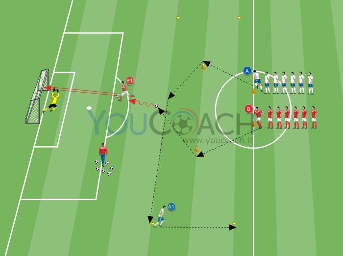 - Αφού εκτελέσουν την αλλαγή κατεύθυνσης στον κώνο, οι παίκτες κατευθύνονται, με τη μέγιστη δυνατή ταχύτητα, προς τη μπάλα που τοποθετεί ο προπονητής στο κέντρο (στο παράδειγμα του σχήματος Β φτάνουν πρώτοι στη μπάλα)