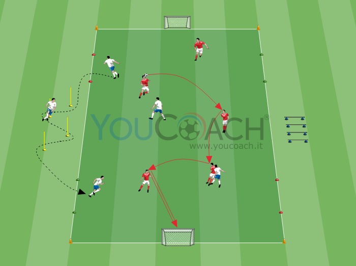 Η άσκηση μπορεί να παιχτεί με έξι έως δέκα παίκτες, ώστε να δημιουργηθούν αγώνες 3 εναντίον 3, 4 εναντίον 4 ή 5 εναντίον 5. Με τέσσερις κώνους τοποθετημένους στα πλάγια, δημιουργήστε ένα γήπεδο 25x20 μέτρων (προσαρμόστε το μέγεθος ανάλογα με τον αριθμό των παικτών). Στο κέντρο και των δύο κοντών πλευρών τοποθετήστε ένα μικρό τέρμα. Τοποθετήστε τις μπάλες στην περιοχή των δύο μικρών τερμάτων. Στην εξωτερική πλευρά της μίας μακράς πλευράς, δημιουργήστε ένα μονοπάτι ζιγκ-ζαγκ με τέσσερα στύλους (αριστερή πλευρά στην εικόνα), ενώ στην εξωτερική πλευρά της άλλης μακράς πλευράς, τοποθετήστε τέσσερις πάνω σε απόσταση περίπου 50 εκατοστών ο ένας από τον άλλο (δεξιά πλευρά στην εικόνα). Κατά μήκος και των δύο μακρών πλευρών της περιμέτρου παιχνιδιού, δημιουργήστε δύο μικρές πόρτες με τους δείκτες για να σηματοδοτήσετε την είσοδο και την έξοδο από τον αγωνιστικό χώρο για το μάθημα συντονισμού (πράσινη και κόκκινη μικρή πόρτα στην εικόνα).