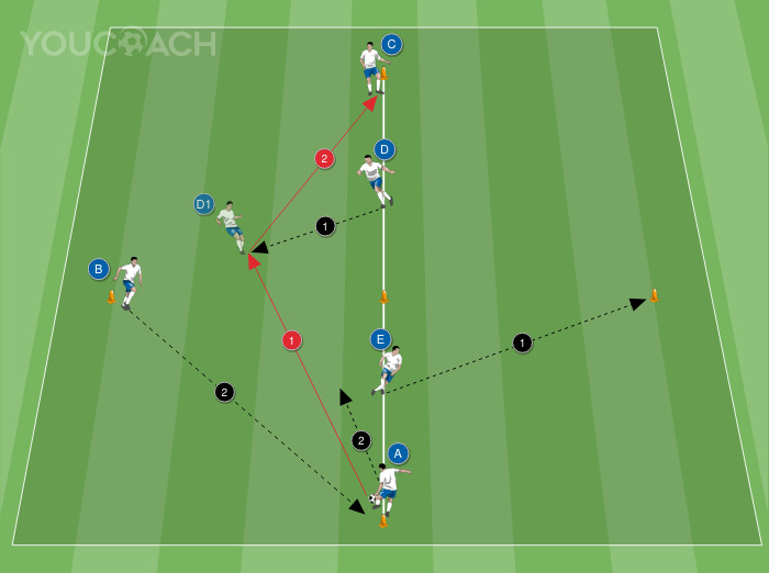 - Ο άλλος παίκτης στο κέντρο του ρόμβου Δ, πιο μακριά από την μπάλα, με αντίθετη κίνηση από την Ε, πηγαίνει προς υποστήριξη για να παραλάβει την μπάλα, κάνει αλλαγή παιχνιδιού στην κορυφή απέναντι από τον παίκτη Γ και κονταίνει προς υποστήριξη προς τον συμπαίκτη του στον οποίο έχει μεταβιβάσει την μπάλα.