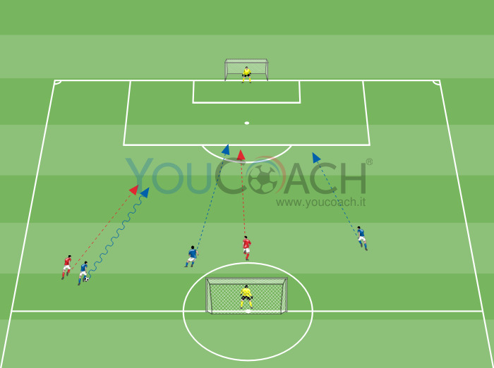 - Ο παίκτης που παραλαμβάνει την μπάλα από τον τερματοφύλακα πρέπει να την ελέγξει για έναν άλλο παίκτη, ο οποίος θα κάνει τη σέντρα για τον συμπαίκτη του που επιτίθεται στο τέρμα, απέναντι από δύο αμυντικούς (μπλε παίκτες)