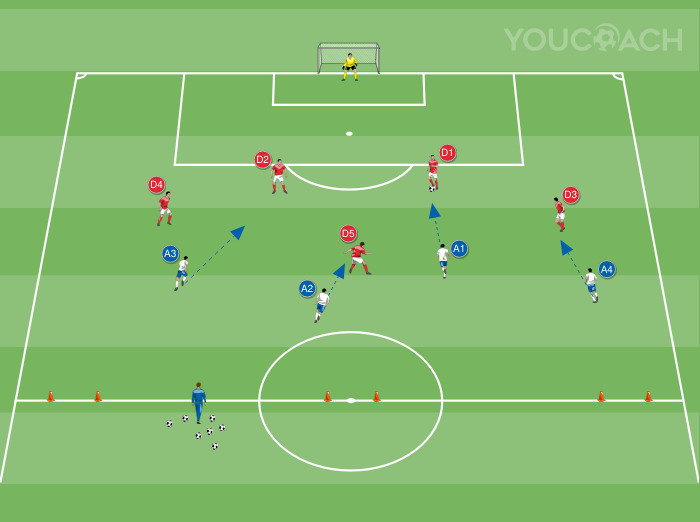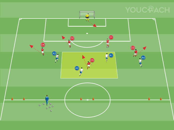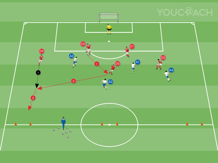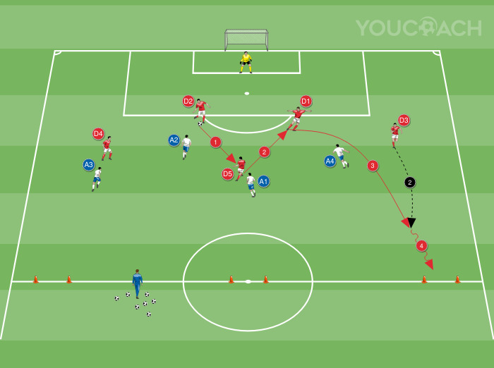 Για την άσκηση, χρησιμοποιήστε ένα κανονικό γήπεδο μισού χώρου με το τέρμα τοποθετημένο στην τελική γραμμή. Τοποθετήστε έξι κώνους στη γραμμή του μισού γηπέδου, σχηματίζοντας τρία τέρματα πλάτους 2 μέτρων (όπως στην εικόνα). Χωρίστε τους παίκτες σε δύο ομάδες, πέντε κόκκινους αμυντικούς και τέσσερις λευκούς επιθετικούς. Οι αμυντικοί τοποθετούνται προσομοιώνοντας μια αμυντική γραμμή 4 ατόμων με ένα παιχνίδι (D5) στην κεντρική περιοχή. Οι επιθετικοί τοποθετούνται με δύο κεντρικούς επιθετικούς και δύο επιθετικούς εξτρέμ. Η μπάλα στην κόκκινη ομάδα (αμυντικοί). Ο τερματοφύλακας τοποθετείται στην άμυνα της εστίας και παίζει με τους αμυντικούς.
