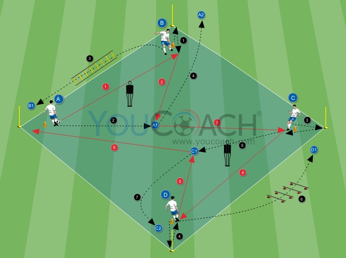 Τοποθετήστε τέσσερις στύλους στις κορυφές για να δημιουργήσετε μια θέση εργασίας σε σχήμα διαμαντιού. Το μήκος των πλευρών του διαμαντιού θα είναι περίπου 25 μέτρα. Οι τέσσερις κώνοι θα πρέπει να τοποθετηθούν εσωτερικά σε απόσταση περίπου 2 μέτρων από τους κίτρινους στύλους που σηματοδοτούν την περίμετρο. Στο εσωτερικό του διαμαντιού τοποθετήστε δύο κούκλες (όπως φαίνεται στην εικόνα). Δίπλα σε κάθε κώνο τοποθετήστε έναν παίκτη (Α, Β, Γ και Δ). Τέσσερις άλλοι παίκτες θα περιμένουν τη σειρά τους ο καθένας τοποθετημένος πίσω από έναν κίτρινο στύλο. Έτσι θα προκύψουν τέσσερα ζευγάρια παικτών που θα τοποθετηθούν στις τέσσερις κορυφές του σταθμού εργασίας (στις τέσσερις γωνίες) για ένα σύνολο οκτώ παικτών. Η εργασία εκτελείται με μία μπάλα (ξεκινώντας με τον παίκτη Α στην εικόνα). Κρατήστε άλλες μπάλες κοντά στις γωνίες για να δώσετε συνέχεια στην εργασία. Τοποθετήστε μια σκάλα ταχύτητας και τέσσερα χαμηλά εμπόδια στη μέση των δύο απέναντι πλευρών όπως στην εικόνα. Τα εμπόδια τοποθετούνται σε απόσταση περίπου 40 έως 50 cm μεταξύ τους.