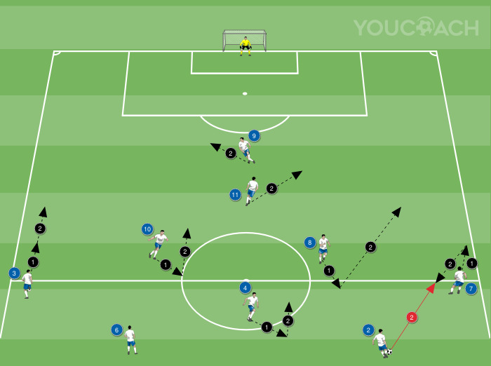 - Ο παίκτης 2 πασάρει την μπάλα στον 7, ο οποίος τρέχει στην άκρη- ο 8 κάνει αλλαγή κατεύθυνσης τρέχοντας διαγώνια προς τη δεξιά πλευρά για να ελευθερώσει χώρο στο κέντρο. Ο 4 και ο 10 κάνουν αλλαγή κατεύθυνσης σηκώνοντας κεφάλι- ο 9 ξεκινάει μια αντίρροπη κίνηση τεντώνοντας την αντίπαλη άμυνα. Ο 11 απλώνεται διαγώνια- ο 3 συνεχίζει να κινείται προς τα εμπρός κατά μήκος της αριστερής πλευράς..