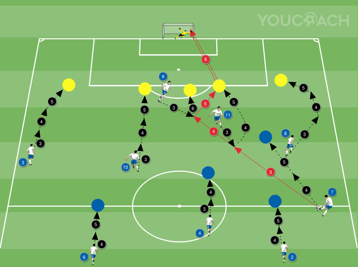 - Ο παίκτης 7 κάνει μια πάσα στον 9, ο οποίος φεύγει για να την συναντήσει, ενώ ο 11 τοποθετείται στη γραμμή της πάσας αφήνοντας τη μπάλα να "περάσει". Ο 8 συνεχίζει να κινείται διαγώνια προς τα εμπρός, προς τη δεξιά πλευρά. ο 10 κάνει σπριντ προς τα εμπρός, προς την άκρη της περιοχής του πέναλτι. Ο 3 συνεχίζει να σπριντάρει προς την αριστερή πλευρά- ο 4 σηκώνεται για να ακολουθήσει την ενέργεια.