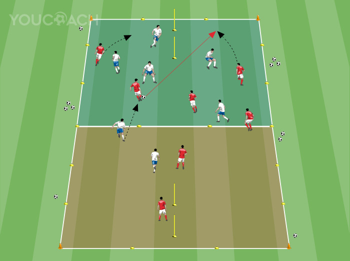 Δημιουργήστε έναν αγωνιστικό χώρο μήκους 45 μέτρων και πλάτους 30 μέτρων με δείκτες (τοποθετήστε τέσσερις κώνους στις κορυφές του αγωνιστικού χώρου). Χωρίστε τον αγωνιστικό χώρο σε δύο ίσα μέρη με μια οριζόντια γραμμή από γραμμές δεικτών που τοποθετούνται στη μέση του μήκους του αγωνιστικού χώρου. Και στα δύο μισά του γηπέδου προς την τελική γραμμή, τοποθετήστε δύο τέρματα που σχηματίζονται με τους στύλους πλάτους 5 μέτρων, τοποθετημένους κάθετα ή κάθετα προς την τελική γραμμή (όπως στην εικόνα). Γύρω από τον αγωνιστικό χώρο, έξω από την περίμετρο, τοποθετήστε μπάλες έτσι ώστε, αν η μπάλα που παίζεται βγει έξω, να μπορεί να συνεχιστεί με μία από τις μπάλες που είναι τοποθετημένες κοντά στην περίμετρο, δίνοντας έτσι καλή συνέχεια στην άσκηση, χωρίς μεγάλες παύσεις. Χωρίστε τους παίκτες σε δύο ισάριθμες ομάδες (των έξι ή επτά παικτών η καθεμία). Κάθε ομάδα (λευκό έναντι κόκκινου στο διάγραμμα) υπερασπίζεται ένα τέρμα που βρίσκεται στο ένα μισό του γηπέδου, ενώ πρέπει να προσπαθήσει να σκοράρει στο άλλο τέρμα που βρίσκεται στο άλλο μισό του γηπέδου (στην περιοχή του γηπέδου του αντιπάλου).