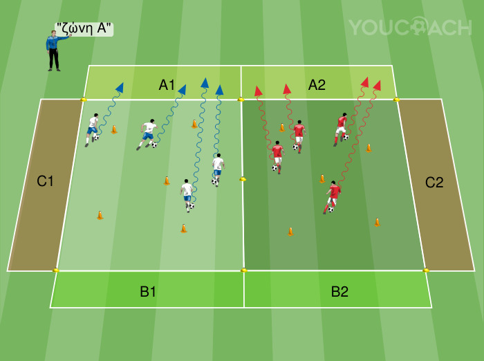 - Για παράδειγμα: ο προπονητής μπορεί να καλέσει "ζώνη Α", οπότε η λευκή ομάδα πρέπει να βάλει όλους τους παίκτες στη ζώνη Α1 το συντομότερο δυνατό και η κόκκινη ομάδα όλους τους παίκτες στη ζώνη Α2.
