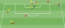 - Με το σήμα του προπονητή οι παίκτες της μιας ομάδας (λευκοί στην εικόνα) διεξάγουν την μπάλα στο ένα μισό του γηπέδου (αριστερό τετράγωνο), οι παίκτες της άλλης ομάδας (κόκκινοι στην εικόνα) διεξάγουν την μπάλα στο άλλο μισό του γηπέδου (δεξί τετράγωνο).