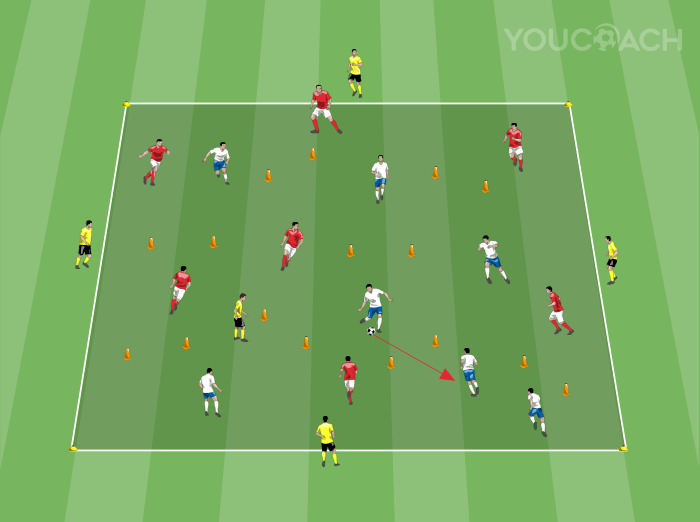 - Μέσα στο ορθογώνιο του αγωνιστικού χώρου διεξάγεται παιχνίδι κατοχής 7v7 (κόκκινοι εναντίον λευκών).