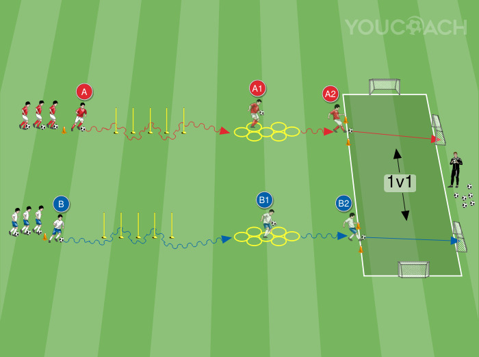 - Ο προπονητής ρίχνει μια μπάλα μέσα στην περιοχή και οι δύο παίκτες μονομαχούν σε κατάσταση 1 εναντίον 1 με στόχο να σουτάρουν στο πλάγιο τέρμα του αντιπάλου