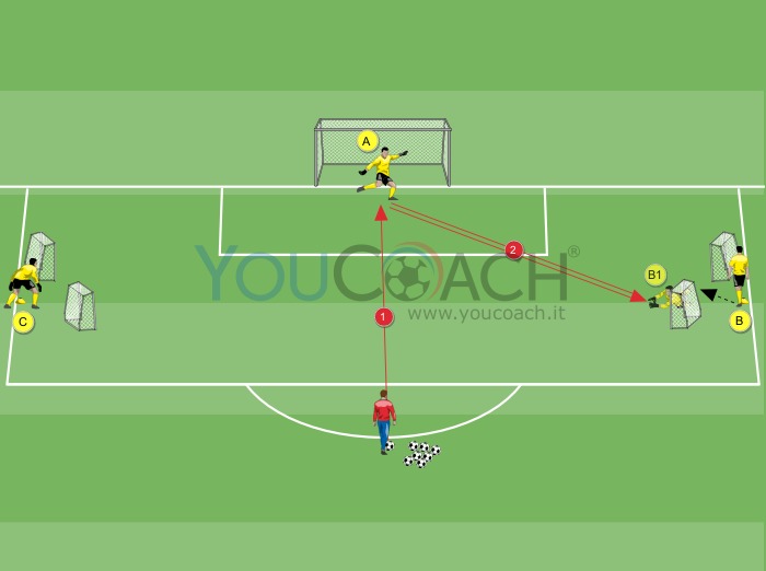 Πραγματοποιήστε την άσκηση μέσα στην περιοχή πέναλτι με τον τερματοφύλακα Α τοποθετημένο ανάμεσα στα δοκάρια του κανονικού τέρματος. Ο προπονητής στέκεται στην άκρη της περιοχής πέναλτι κοντά στο ημικύκλιο με έναν ικανοποιητικό αριθμό μπαλών, οι τερματοφύλακες Β και Γ στέκονται στους στύλους στην πλευρά της περιοχής πέναλτι 8 μέτρα από την τελική γραμμή, ένας στη δεξιά πλευρά της περιοχής και ένας στην αριστερή πλευρά. Σε απόσταση περίπου 1,5 μέτρου από την παρειά, τοποθετήστε δύο μικρά τέρματα διαστάσεων 1,10x1 μέτρο. Τα δύο μικρά τέρματα τοποθετούνται η μία δίπλα στην άλλη σε απόσταση 2 μέτρων η μία από την άλλη (ο χώρος μεταξύ των δύο μικρών τερμάτων είναι περίπου δύο μέτρα).
