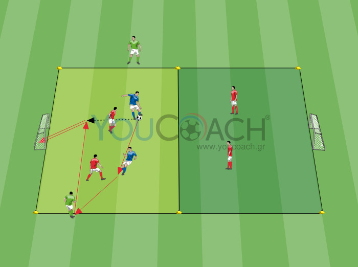 Δημιουργήστε έναν αγωνιστικό χώρο 20x20 χρησιμοποιώντας τους δείκτες και χωρίστε δύο ζώνες με τους κώνους. Στις μεγάλες πλευρές του ορθογωνίου τοποθετήστε τα δύο μικρά τέρματα. Χωρίστε τους παίκτες σε 4 κόκκινους αμυντικούς (2 για κάθε μισό του γηπέδου), μπλε επιθετικούς (που μπορούν να κινούνται ελεύθερα μέσα στην περιοχή παιχνιδιού) και 2 πράσινους - στηρίγματα (που μπορούν να κινούνται κατά μήκος των πλευρών του ορθογωνίου παιχνιδιού).