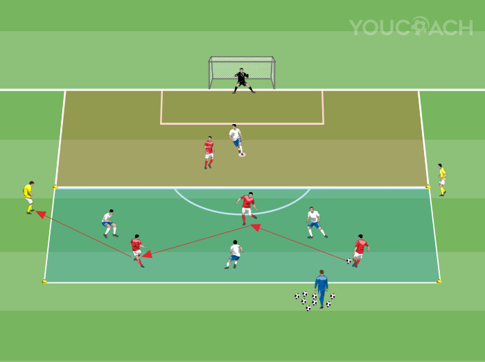 Διαίρεσε τους παίκτες σε δύο ομάδες των τεσσάρων (λευκή ομάδα εναντίον κόκκινης όπως φαίνεται στην εικόνα). Για κάθε ομάδα, τρεις παίκτες τοποθετούνται μέσα στη μπλε ζώνη, ενώ ο τέταρτος παίκτης βρίσκεται στην κόκκινη ζώνη. Ένας παίκτης υποστήριξης τοποθετείται σε κάθε πλευρά του γηπέδου (κίτρινοι παίκτες στην εικόνα). Ο τερματοφύλακας υπερασπίζεται το τέρμα. Ο προπονητής στέκεται έξω από το γήπεδο με επάρκεια μπάλων.