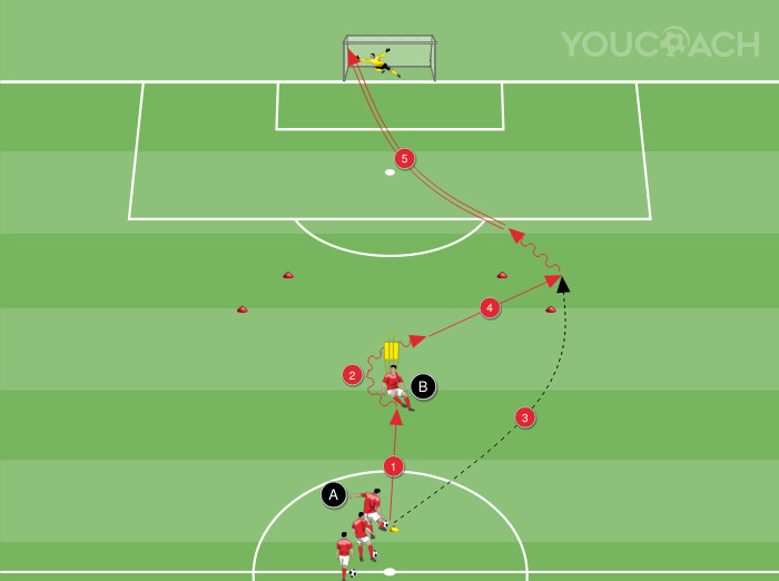 Η περιοχή στην οποία διεξάγεται η άσκηση συμπίπτει με την περιοχή που γειτνιάζει με την περιοχή πέναλτι. Τοποθετήστε έναν πάσσαλο σε απόσταση περίπου 5 μέτρων από την περιοχή πέναλτι, στη μέση Τοποθετήστε έναν μικρό κώνο σε απόσταση περίπου 10 μέτρων από τον πάσσαλο, στη μέση (θέση αρχικού επιθετικού). Τοποθετήστε 2 δείκτες σε κάθε πλευρά του πασσάλου, σχηματίζοντας έναν στόχο περίπου 3 μέτρων, διαγώνια, μέσα από τον οποίο πρέπει να περάσει η ασίστ για τον επιθετικό (όπως φαίνεται στο σχήμα). Οι παίκτες ξεκινούν από τον μικρό κώνο, με την μπάλα. Ένας παίκτης (Β) σταματά στο πάσσαλο, πίσω από το τέρμα. Οι τερματοφύλακες υπερασπίζονται τα τέρματα.