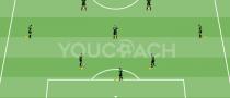 Κάθε παίκτης, με τη σειρά του, αρχίζει να εκτελεί την άσκηση τοποθετημένος στο κέντρο των δύο στύλων. Ο τερματοφύλακας τοποθετείται για να υπερασπιστεί το τέρμα. Ενδεχομένως να χρησιμοποιήσετε δύο τερματοφύλακες, οι οποίοι, όπως και οι παίκτες που τερματίζουν, εναλλάσσονται κατά τη διάρκεια των επαναλήψεων, έτσι ώστε να υπάρχει επαρκής αποκατάσταση δεδομένης της έντασης της άσκησης.