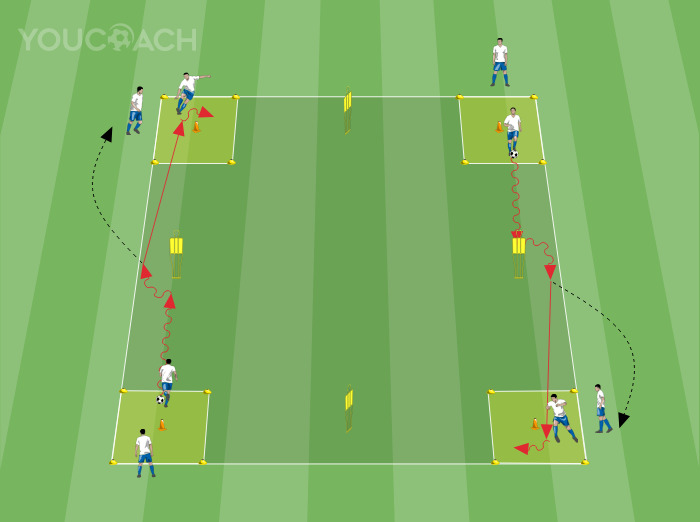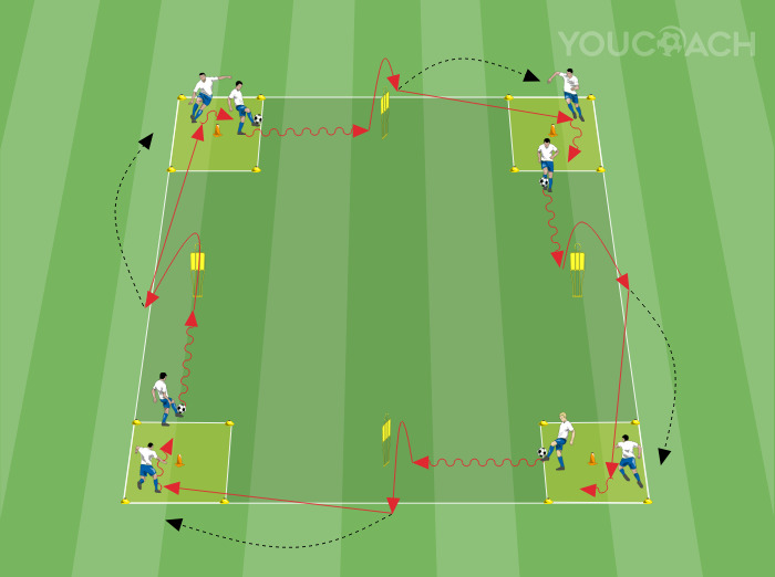 - Ο παίκτης, στον οποίο έχει περάσει η μπάλα, εκτελεί έναν προσανατολισμένο έλεγχο σε σχέση με τον κεντρικό κώνο που βρίσκεται στο κέντρο του μίνι-τετραγώνου και ξεκινά ξανά σε αγωγή μπάλας για να αντιμετωπίσει τον επόμενο κώνο κ.ο.κ.
