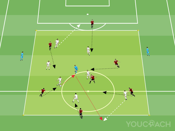 - Αντίθετα, οι παίκτες της λευκής ομάδας πρέπει να διατηρήσουν την κατοχή, δημιουργώντας νέες γραμμές πάσας, οι οποίες προκύπτουν από την επίθεση στον χώρο που ελευθερώνεται στην πλευρά από την κίνηση του κόκκινου παίκτη. Σε αυτόν τον χώρο θα κινηθεί λευκός παίκτης μόλις η ομάδα του διατηρήσει την κατοχή.