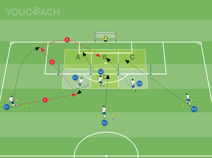 Η άσκηση πραγματοποιείται σε ένα κανονικό μισό γήπεδο. Εντός της περιοχής πέναλτι, δημιουργήστε τέσσερις ζώνες επίθεσης με μπάλα με τους δείκτες όπως στο διάγραμμα:τέσσερα τετράγωνα πλευράς περίπου 10 μέτρων (ζώνες Α - Β - Γ - Δ). Εντός των τεσσάρων αυτών ζωνών, τοποθετήστε τέσσερις στύλους σε μια γραμμή σε απόσταση περίπου 10 μέτρων ο ένας από τον άλλο, ώστε να σχηματίσουν μια οριζόντια γραμμή.Οι στύλες προσομοιώνουν την άμυνα του αντιπάλου με γραμμή 4 ατόμων εντός της περιοχής πέναλτι.. Χρησιμοποιώντας τους δε'ικτες, δημιουργήστε τρία σημεία εκκίνησης από τις οποίες ξεκινούν οι εξελίξεις του παιχνιδιού.Οι πλαϊνές θύρες βρίσκονται σε σχέση με τον χώρο πέναλτι σε απόσταση περίπου 10 μέτρων (θέσεις εκκίνησης P1 και P3), η τρίτη θύρα μπροστά από το τέρμα βρίσκεται σε σχέση με τον χώρο πέναλτι σε απόσταση περίπου 15 μέτρων (θέση P2 στην εικόνα). Τοποθετήστε έναν παίκτη ανά θύρα με την μπάλα και τρεις παίκτες στην άκρη της περιοχής πέναλτι χωρίς την μπάλα (παίκτες G1 - G2 - G3 στο διάγραμμα). Ο τερματοφύλακας τοποθετείται στην άμυνα του κανονικού τέρματος.