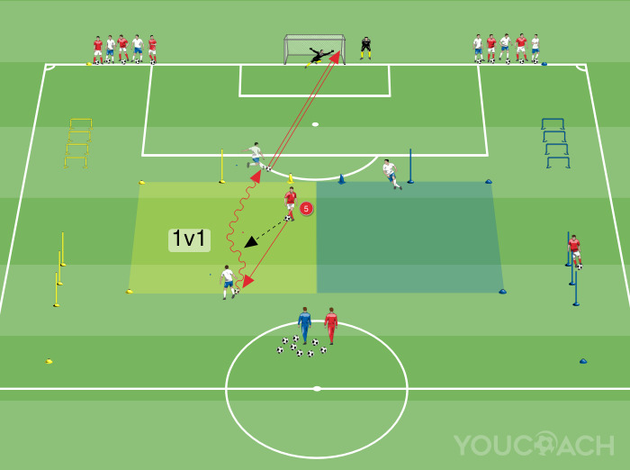 - Η άσκηση αποτελείται από διάφορες ανταλλαγές και κινήσεις μαρκαρίσματος που διανθίζονται με δουλειά υπό όρους και ολοκληρώνεται με ένα 1 εναντίον 1 και ένα πιθανό σουτ προς το τέρμα.