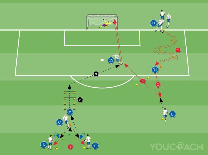 - Ο παίκτης Γ ξεκινά με σπριντ προς τον Α, ο οποίος του πετάει την μπάλα με τα χέρια, ώστε ο Γ να την επιστρέψει με το εσωτερικό του δεξιού ποδιού με ένα άγγιγμα στον συμπαίκτη του. Μετά τη μετάδοση ο Γ αγγίζει τον κώνο πίσω του και κάνει το ίδιο πράγμα κινούμενος προς τον Β στον οποίο επιστρέφει τη μπάλα με το εσωτερικό αριστερό πόδι. Εν τω μεταξύ, ο παίκτης Δ αρχίζει να οδηγεί την μπάλα εκτελώντας σλάλομ μεταξύ των κώνων