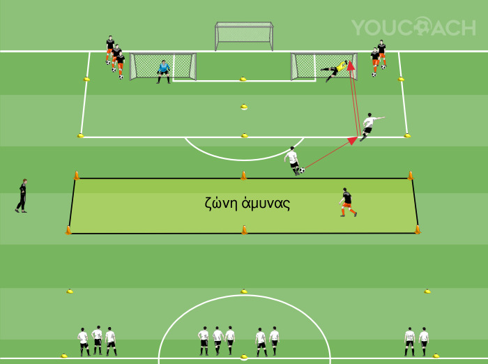 Στο κέντρο του γηπέδου, τοποθετήστε τις γραμμές δεικτών για να οριοθετήσετε τον αγωνιστικό χώρο (όπως στην εικόνα). Τοποθετήστε δύο τέρματα στην άκρη της μικρής περιοχής, στη μέση μεταξύ του σημείου του πέναλτι και του πλευρικού ορίου του γηπέδου. Οι δύο αγωνιστικοί χώροι χωρίζονται στη μέση θεωρώντας το μέσο της περιοχής πέναλτι. Σε απόσταση περίπου 3 μέτρων από την άκρη της περιοχής, σχηματίστε μια λωρίδα 5 μέτρων που θα αποτελέσει τη γραμμή εντός της οποίας θα δρουν οι αμυντικοί (ζώνη άμυνας). Χωρίστε τους παίκτες σε τρεις ομάδες των έξι ατόμων. Οι αμυντικοί (μαύροι στην εικόνα) ξεκινούν πίσω από τα τέρματα με τη μπάλα και τοποθετούνται τρεις ανά γήπεδο. Οι επιτιθέμενοι συνεργάζονται σε ζευγάρια και ξεκινούν στο κέντρο του γηπέδου χωρίς την μπάλα. Παίζεται ένα 2 εναντίον 1 σε κάθε γήπεδο. Οι τερματοφύλακες υπερασπίζονται τα τέρματα.