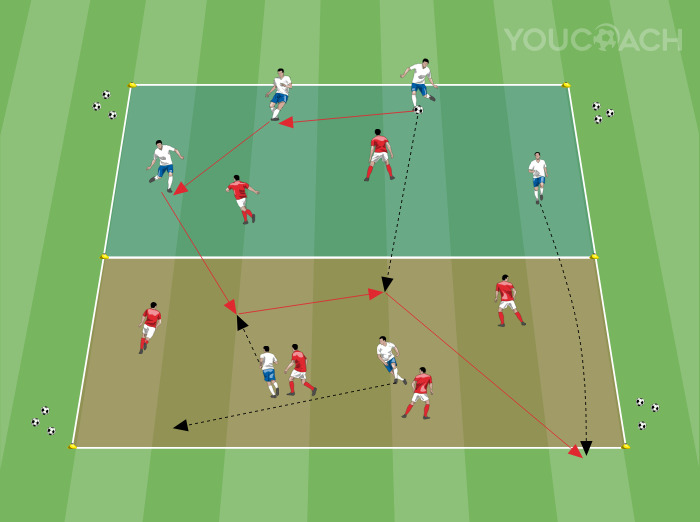 - Όποιος ξεκινάει με την κατοχή της μπάλας έχει μια αρχική κατάσταση αριθμητικής υπεροχής στο δικό του μισό του γηπέδου 4 εναντίον 2 για να αναπτύξει το παιχνίδι από κάτω και να κατακτήσει το αντίπαλο μισό του γηπέδου (στο παράδειγμα οι 4 λευκοί παίκτες εναντίον των 2 κόκκινων επιθετικών)