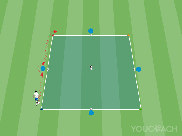 - Σε κάθε χρωματιστό κώνο, ένας παίκτης τοποθετείται με μια μπάλα και, με το σήμα του προπονητή, ο παίκτης αρχίζει να οδηγεί την μπάλα γύρω από τον αγωνιστικό χώρο (κίνηση περιμετρικά).
