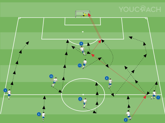 Επιθετικός συνδυασμός για το 4-3-3: μακρινό σουτ από τον ψηλό εξωτερικό παίκτη με μπαλιά για τον απέναντι εξωτερικό παίκτη.