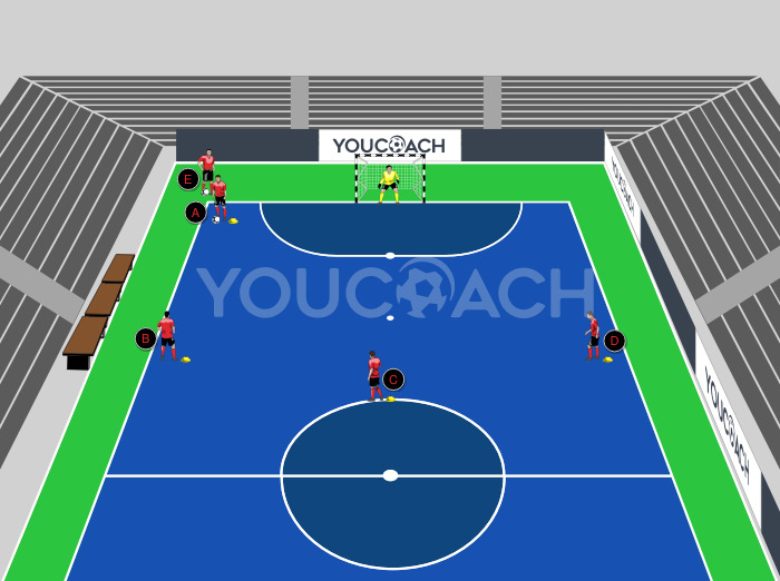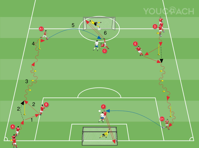 1 εναντίον 1 - Άσκηση για πάσες και προσανατολισμένη υποδοχή με κατάσταση 1 εναντίον 1 για εκτέλεση σουτ προς την εστία. -