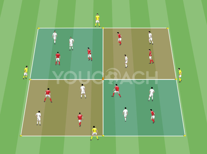 Possession - Μικρό παιχνίδι 4 εναντίον 4 + 4 με στόχο τη διατήρηση της κατοχής της μπάλας και το σουτ σε 4 μικρά τέρματα. -