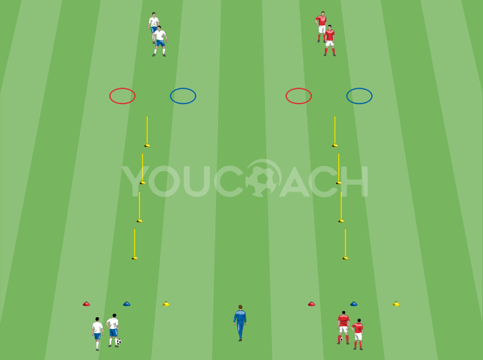 1v1 attacking - Σε αυτή την άσκηση ο παίκτης πρέπει να ντριμπλάρει με βάση τις εντολές και στη συνέχεια να προσπαθήσει να περάσει την μπάλα στον συμπαίκτη του. -